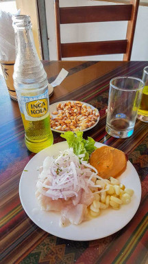 Le ceviche est préparé à base de poisson cru et de jus de citron, du piment (aji), de coriandre et d’oignon. Le poisson « cuit » dans le jus de citron est ensuite servi accompagné de patate douce, de manioc, de maïs et parfois même de bananes plantains. Bref, un vrai régal !