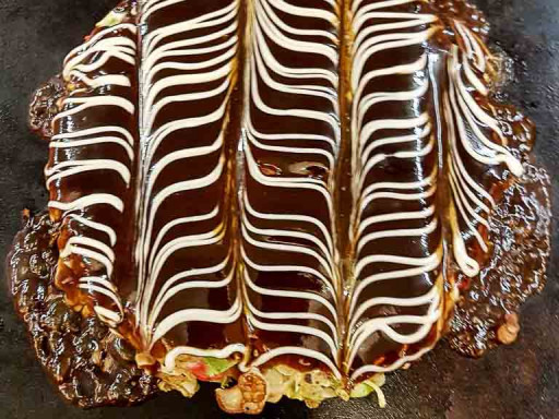 L’okonomiyaki est un plat japonais composé d’une pâte qui enrobe un nombre d’ingrédients très variables découpés en petits morceaux, le tout étant cuit sur une plaque chauffante. Le tout est recouvert d’une sauce brune et de mayonnaise.