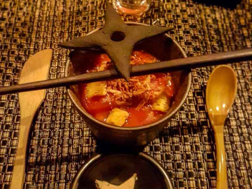 Boisson chaude, sucrée et épaisse préparée avec du maïs violet, de la cannelle et des clous de girofle. Bonne surprise également.